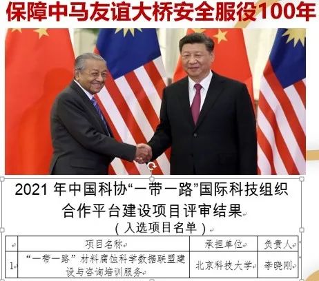 在一带一路建设中,团队承接了保障中马友谊大桥安全服役百年的重大任务。针对高温、高湿、高盐和高辐射等严苛海洋大气腐蚀环境,利用耐蚀元素与组织调控和腐蚀大数据方法,成功研发出适用于“四高”环境的高镍耐蚀钢及其配套关键技术。