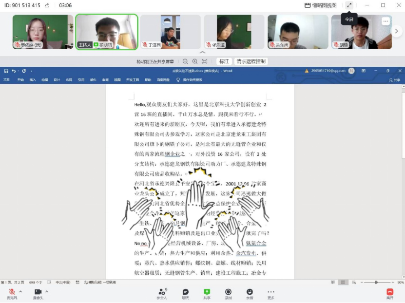 大家就参观承德建龙的选题进行了热烈的讨论,兴致勃勃地准备带观众探秘钢铁企业。敲定选题后,班级内进行了明确的分工,班长负责与直播企业洽谈,确定直播流程;其他同学有的负责写直播稿、有的负责做推送宣传直播、有的负责公众号运营、有的负责采访问题拟定,有的负责海报制作……大家高效且认真,迅速完成了直播前期准备,并进行了直播前的彩排。经过讨论,大家决定选在今年训练营54场直播中的第一场开展,既紧张又兴奋,是压力,也是动力!