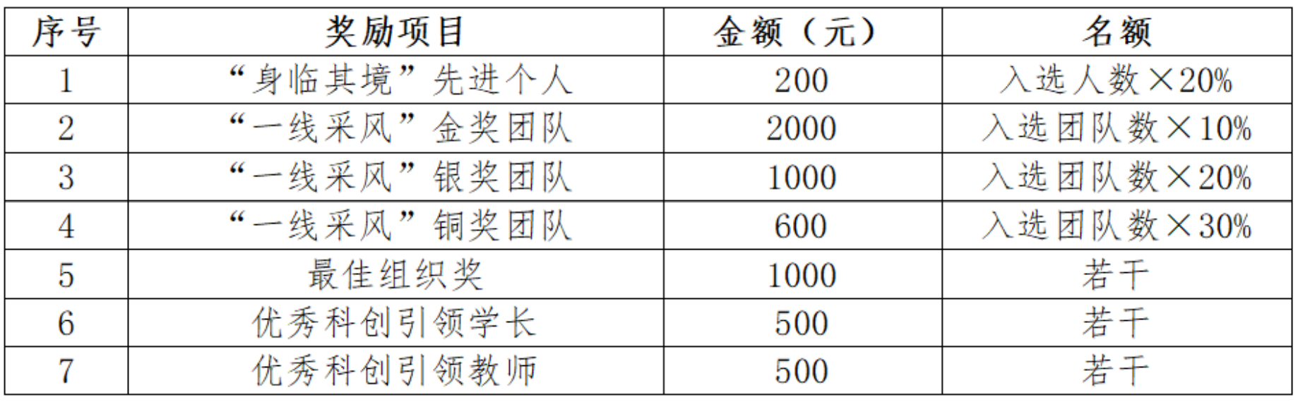 获奖团队、个人可获得荣誉证书、创新学分,奖金(税前)具体如下: