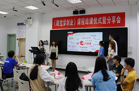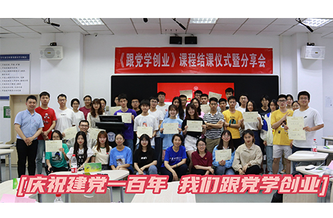 6月17日晚,“庆祝建党一百年,我们跟党学创业!”热烈的口号在逸夫楼403智慧教室响了起来,我校创新创业特色课程思政《跟党学创业》也随之顺利结课。8个小组、40名同学高举着最佳展示奖等证书,在教室里纷纷合影留念,记录这门特别的公选课、留下珍贵的友谊。招生就业处处长、创新创业中心主任、课程负责人尹兆华和马克思主义学院副院长刘丽敏教授参与了课程授课、评委,汇报由创新创业中心邓张升主持。