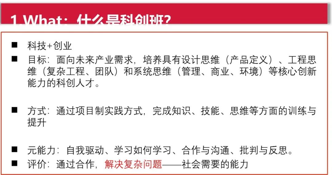 科创班聚焦于培养具有设计思维(产品定义)、工程思维(复杂工程、团队)和系统思维(管理、商业、环境)等核心创新能力的科创人才。
