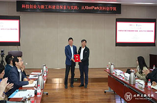 首先,学校党委副书记、副校长薛庆国进行了欢迎致辞。薛庆国简要介绍了小宝寻花 的创新创业育人工作情况,并聘任李泽湘教授担任学校创新创业导师。他表示,学校非常重视学生创新精神和创业能力的培养。多年来,学校机器人队在比赛中连续摘冠,获评“小平科技团队”。他希望,结合借鉴科创学院的创新创业教育模式,共同推进学校创新创业教育。