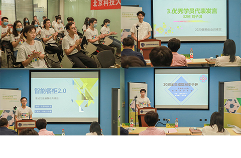 结营仪式由一段回顾视频拉开帷幕,视频展现创业训练营学员们勤学善思、开拓创新、勇于实践、团结合作的一幕幕生动场景,为同学们留下了许多珍贵的记忆。接着,创新创业中心副主任王丽红老师针对训练营的实施情况,从训练营的课程内容,开展形式和学习成果三方面进行了总结。训练营32班的刘子淇同学作为优秀学员代表发言,他讲述了自己参与训练营课程和比赛的体验,也分享了自己三周以来的收获与感悟。10班乔璟龙同学和39班王浩晨同学代表模拟创业大赛的升级组和创意组优秀项目班级先后展示了“全自动防溺水手环”项目和“智能餐柜2.0”项目,展现了同学们对生命的关怀和生活品质的关注。